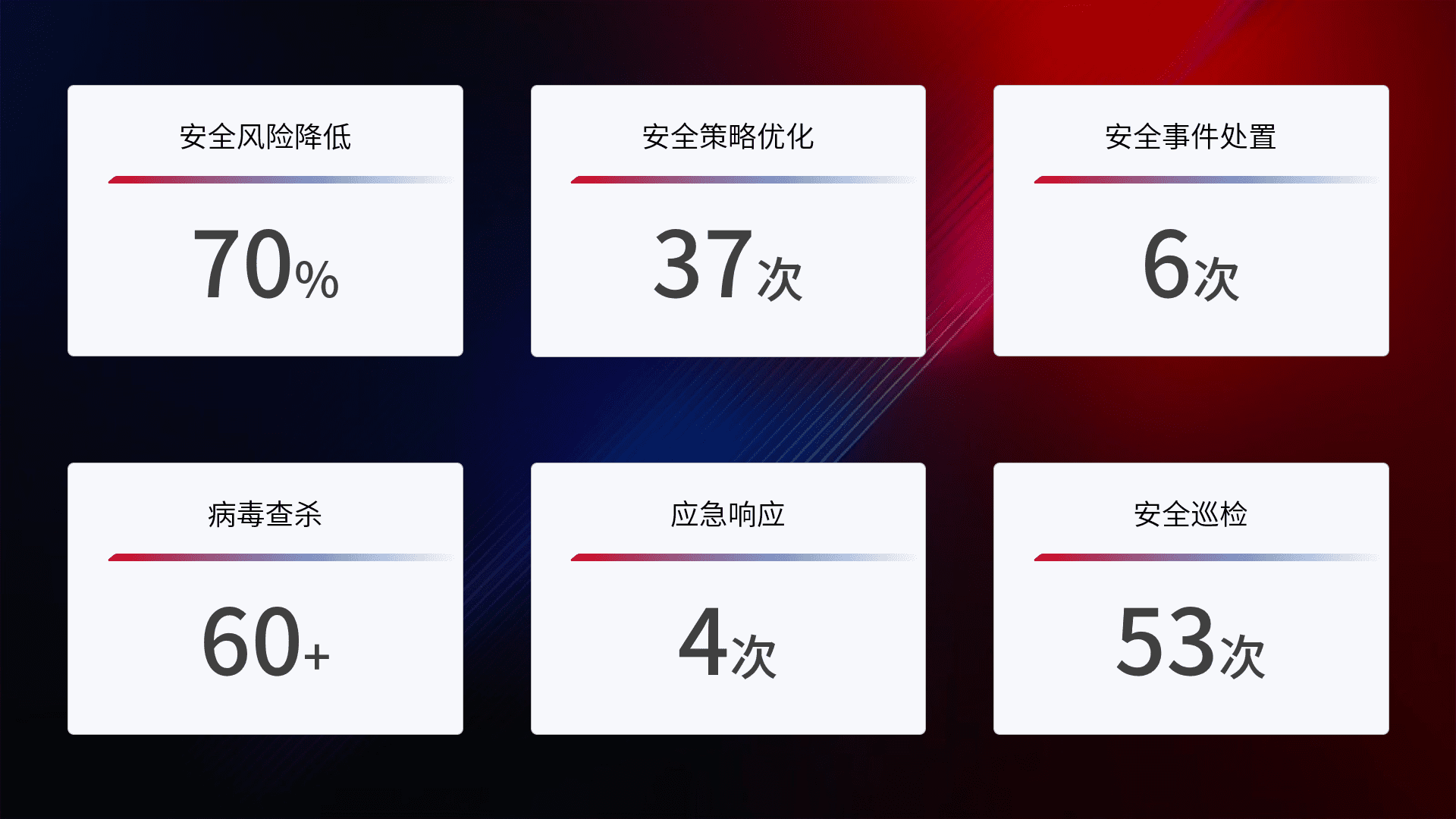 提供全面的安全事件报告体系,,包括处置报告、、周报、、、季度和年度总结,,结合持续监控,,帮助客户深入了解网络安全状况。。。。